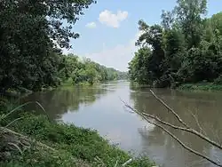 A chute cutoff channel can form during a flood resulting in an overbank flow where water goes over the banks of the river, creating erosion of the surrounding landscape. More studies need to be done on how the magnitude of these floods and their recurrence interval are related to how often these chute cutoff channels form.[6] Neck cutoff channels are commonly formed the same way when an overbank flow occurs during a flood and the narrow piece of land between a bend in a meander is eroded away; this is known as rush-cutting.[5] A meander can also be cutoff by a channel due to excess sediment upstream as a result of high erosion rates. This leads to a cutoff channel forming since a river might no longer be able to carry that sediment through the bend efficiently, so the river forms a new path for it to flow.[7] Meander cutoffs can also be formed by humans; by removing a beaver dam, the likelihood that meander cutoff channels will be formed downstream increases.[7] A cutoff channel can be engineered for the purpose of navigation, traditionally for water mill leats and for controlling the possibility of any future flood were done on the lower reaches away from the tide. These meander cutoffs straighten a river.[8] Many rivers are transformed by humans, becoming less sinuous.[6]