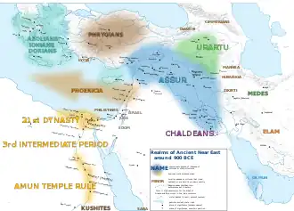 Its borders were limited in the north by the non-Iranian states of Gizilbunda and Mannea, and to its south by Ellipi and Elam.[17][19] Gizilbunda was located in the Qaflankuh Mountains, and Ellipi was located in the south of modern Lorestan Province.[19] On the east and southeast of Media, as described by the Assyrians, another land with the name of "Patušarra" appears. This land was located near a mountain range which the Assyrians call "Bikni" and describe as "Lapis Lazuli Mountain". There are differing opinions on the location of this mountain. Mount Damavand of Tehran and Alvand of Hamadan are two proposed sites. This location is the most remote eastern area that the Assyrians knew of or reached during their expansion until the beginning of the 7th century BC.[20]