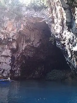 In Greek mythology, Melissani was the Cave of the Nymphs. It features a lake surrounded with trees and forest, and is located east of the mountains of Evmorfia and Agia Dynati. Tourism is common.
