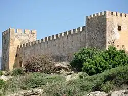 Right after the central gate, a domed road opens up that leads through a second gate and then a third in the interior of the castle, where the habitable part was and which was separated from the north part with a vertical low wall (approximately 6 meters), fortified with five towers (four square and one octagonal) is dated to the period after 1500, when the Turks tried to reinforce the population and the fortification of the castle. In the interior there are ruins of the houses where the Venetian lords lived during the period of rise, the paved street that led to the sea gate, the ruins of a Turkish bath, the Byzantine church of St. Sophia, close to which a slate with Latin lettering was found (dating back to 1714), parts of Doric pillars, a monolithic granite pillar (1493/4), unlined, with a capital on the top of Byzantine style, which is supposed to have supported either the winged lion of Saint Mark, the symbol of Venice, or the bust of Morosini. That is why it is erroneously called "Morosini's stele".[1] There was an inscription on the capital that has not survived to this day. On the left of the entrance are the ruins of the building which originally Imbrahem used as a residence in 1826 and later general Maison. The French of the liberating corps remained in the area till 1833 and the construction of the church of Santa Sotira, which is still attributed to them. In the interior of the castle there are also a few cisterns and the remains of the British prisoner's cemetery during the World War II.