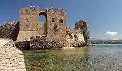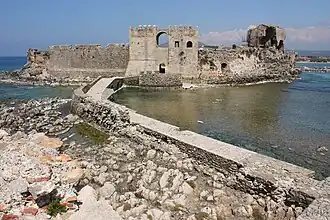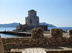 The Castle of Methoni is a medieval fortification in the port town of Methoni, Messenia, in southwestern Greece. The castle of Methoni occupies the whole area of the cape and the southwestern coast to the small islet that has also been fortified with an octagonal tower and is protected by the sea on its three sides. Its north part, the one that looks to land, is covered by a heavily fortified acropolis. A deep moat separates the castle from the land and communication was achieved by a wooden bridge. The Venetians built on the ancient battlements and added on and repaired it during both periods that they occupied the castle.