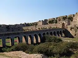 Its entrance is accessed by a stone bridge of 14 arches, that was built over a moat by the technicians of the Expédition scientifique de Morée, that accompanied general Maison. The entrance gate ends in an arch framed on the right and left by pilasters with Corinthian capitals. It is considered to be the work of Venetians after 1700. On the right and left of the entrance two large battlements can be seen. One battlement is the one built by general Antonio Loredan, during the second period of Venetian occupation.