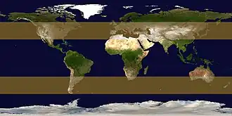 The middle latitudes, also called the mid-latitudes (sometimes spelled midlatitudes) or moderate latitudes, are spatial regions on either hemisphere of Earth, located between the Tropic of Cancer (latitude 23°26′09.6″) and the Arctic Circle (66°33′50.4″) in the northern hemisphere and between the Tropic of Capricorn (-23°26′09.6″) and the Antarctic Circle (-66°33′50.4″) in the southern hemisphere.[1][2] They include Earth's subtropical and temperate zones, which lie between the two tropics and the polar circles. Weather fronts and extratropical cyclones are usually found in this area, as well as occasional tropical cyclones or subtropical cyclones, which have traveled from their areas of formation closer to the Equator.[3]