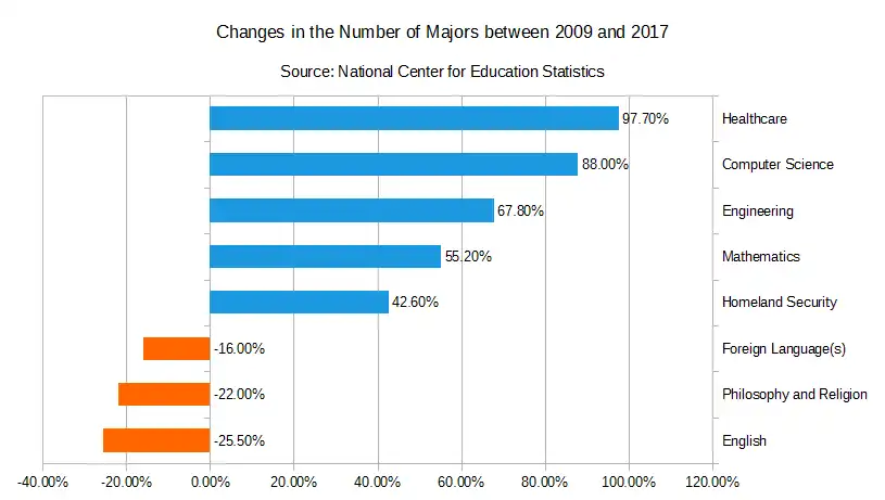 According to the American Academy of Arts and Sciences, students were turning away from liberal arts programs. Between 2012 and 2015, the number of graduates in the humanities dropped from 234,737 to 212,512. Consequently, many schools have relinquished these subjects, dismissed faculty members, or closed completely.[181] Data from the National Center for Education Statistics revealed that between 2008 and 2017, the number of people majoring in English plummeted by just over a quarter. At the same time, those in philosophy and religion fell 22% and those who studied foreign languages dropped 16%. Meanwhile, the number of university students majoring in homeland security, science, technology, engineering, and mathematics (STEM), and healthcare skyrocketed. (See figure below.)[182]