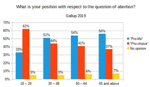 - ↑ ""Pro-Choice" or "Pro-Life," 2018 Demographic Table". Gallup. 2019. Retrieved November 16, 2019.