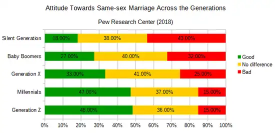 Surveys conducted in 2018 by the Pew Research Center found that Millennials and Generation Z held similar views on a variety of social and political topics, setting them apart from older cohorts. Majorities of Millennials believed that climate change was real and was due to human activities, that the government should play a more active role in solving their problems, that pre-nuptial cohabitation was not wrong, and that ethnic and cultural diversity was good for society. Large numbers of Millennials thought that single motherhood, same-sex marriage, and interracial marriage were neither a positive nor negative for society. In the case of financial responsibility in a two-parent household, though, majorities from across the generations answered that it should be shared, with 79% of both Millennials and Generation Z agreeing. Across all the generations surveyed, at least 84% thought that both parents ought to be responsible for rearing children. Very few thought that fathers should be the ones mainly responsible for taking care of children.[198]