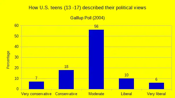 A 2004 Gallup poll of Americans aged 13 to 17 found that 71% said their social and political views were more or less the same as those of their parents, with just over half holding politically moderate views. (See figure above.)[194]