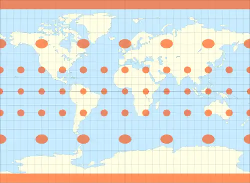 where λ is the longitude from the central meridian of the projection, and φ is the latitude.[2] Meridians are thus about 0.733 the length of the equator.