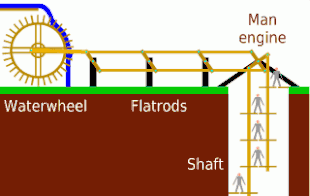 To begin with the ore was chiseled free and carted to the surface of the open pits or shallow mines in baskets. Once shaft depths increased to between about 10–60 metres hand winches (Handhäspel) were used, operated by one or two workers (Knechten). The crude ore was placed in wooden buckets for transportation. For the rather short, horizontal gangways leading to the shaft the ore was carried in Trogs for several centuries (long before the introduction of blasting). In the 17th century the shafts reached depths of between 100 and 200 m. Ore could no longer be removed by hand and horsepower was increasingly used. The horses worked in a cone-shaped building, the Göpel or Gaipel, which housed a horse whim, a winch that was driven by the horses walking in a circle. The hauling cable (made of natural fibre) or cast-iron chain was wound up and down over a vertical axle. The cable was routed down the shaft and hauled barrels of ore up and down. Due to the shaft's incline, barrels were covered with iron runners on one side, resting partly on the side of the shaft. Above ground at the pithead the ore was emptied out and transported away by horse and cart for processing. From the 18th century shaft depths of several hundred metres were being achieved and horse whims were reaching the limits of their capability. Where the mines were lucrative and their energy consumption high as a result of shaft depth or the ingress of water, water power had been used since the 16th century. Water wheels (Kunsträder) drove piston pumps in order to keep the mine dewatered (zu Sumpfe). Reversible water wheels (Kehrräder) powered the transportation of ore or winnings. Depending on the terrain conditions the reversible wheels were located either in underground wheel houses (Radstuben) near the shaft (the cable drum being set on the same axle as the water wheel) or above ground in the valley. When using the latter method the wheel's rotation was converted into reciprocating motion using a crank mechanism ( Krummen Zapfen) and transmitted over twin flat rods, several hundred metres long, to the shaft. Here, reciprocating motion was re-converted into rotary motion.