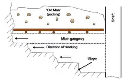 The packing (gangue material used for filling) from the upper main gangways was placed in the exhausted cavities (the so-called 'old man' or Alter Mann). This required the erection of a wooden ceiling over the active workings so that packing material did not fall into it and onto the face workers there. If the expected supply of ore or its quality did not justify sinking the main shaft deeper, or if the workings were a long way from it, draw-shafts were sunk. These blind shafts saved having to pack the 'old man'. In the Hornstatt, 1 or 2 labourers (Knechte) worked a hand winch and lifted the ore to the next highest main gallery.