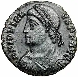 The emperor Jovian (363-364) who reestablished Christianity as the official religion of the Roman Empire was born in Moesia Prima, in Singidunum. In his early career, later Roman emperor Theodosius I served as military commander of Moesia Prima in 373.[5] In 382 Roman emperors Theodosius I and Gratian met in Viminacium, the capital of Moesia Prima, during the Gothic Wars.[6]
