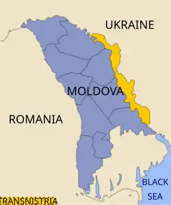 The Moldova–Ukraine border, the official border between Republic of Moldova and Ukraine, was established after the dissolution of the Soviet Union. The length of the inland border is 1,222 kilometres (759 mi),[1] of which 267 kilometres (166 mi) is fluvial (i.e., along rivers) and 955 kilometres (593 mi) is land border.[2] About 454 kilometres (282 mi) of it constitutes the de facto border between Ukraine and the unrecognized breakaway republic of Transnistria.[2]