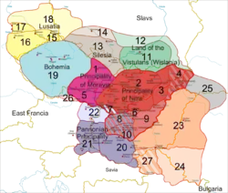 A variety of Germanic and major Slavic tribes crossed through Moravia during the Migration Period before Slavs established themselves in the 6th century AD. At the end of the 8th century, the Moravian Principality came into being in present-day south-eastern Moravia, Záhorie in south-western Slovakia and parts of Lower Austria. In 833 AD, this became the state of Great Moravia[30] with the conquest of the Principality of Nitra (present-day Slovakia). Their first king was Mojmír I (ruled 830–846). Louis the German invaded Moravia and replaced Mojmír I with his nephew Rastiz who became St. Rastislav.[31] St. Rastislav (846–870) tried to emancipate his land from the Carolingian influence, so he sent envoys to Rome to get missionaries to come. When Rome refused he turned to Constantinople to the Byzantine emperor Michael. The result was the mission of Saints Cyril and Methodius who translated liturgical books into Slavonic, which had lately been elevated by the Pope to the same level as Latin and Greek. Methodius became the first Moravian archbishop, the first archbishop in Slavic world, but after his death the German influence again prevailed and the disciples of Methodius were forced to flee. Great Moravia reached its greatest territorial extent in the 890s under Svatopluk I. At this time, the empire encompassed the territory of the present-day Czech Republic and Slovakia, the western part of present Hungary (Pannonia), as well as Lusatia in present-day Germany and Silesia and the upper Vistula basin in southern Poland. After Svatopluk's death in 895, the Bohemian princes defected to become vassals of the East Frankish ruler Arnulf of Carinthia, and the Moravian state ceased to exist after being overrun by invading Magyars in 907.[32][33]