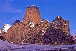 Mount Asgard (Inuktitut: ᓯᕙᓂᑎᕈᑎᖑᐊᒃ, Sivanitirutinguak[2][3][4]) is a twin peaked mountain with two flat-topped, cylindrical, rock towers, separated by a saddle. It is located in Auyuittuq National Park, on the Cumberland Peninsula of Baffin Island, Nunavut, Canada. The peak is named after Asgard, the realm of the Æsir (gods) in Norse mythology. Mount Asgard is perhaps the most famous of the Baffin Mountains.[5]