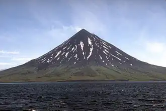 Mount Cleveland is an almost symmetrical andesite stratovolcano in the Islands of Four Mountains, a volcanic group in the Aleutian Arc.[4] Like all stratovolcanoes, Mount Cleveland grew as explosive eruptions, effusive eruptions, and lahars built it layer by layer into a convex shape.[12] It lies southeast of Mount Carlisle and northeast of Herbert Island. Mount Cleveland forms the western half of Chuginadak Island, a broad and uneven bell-shaped landmass, and is the highest of the four volcanic islands.[13] The island is completely uninhabited; the nearest settlement is Nikolski on Umnak Island, about 75 km (47 mi) eastward.[9]