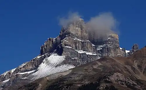 Like other mountains in Banff Park, Mount Hector is composed of sedimentary rock laid down during the Precambrian to Jurassic periods.[7] Formed in shallow seas, this sedimentary rock was pushed east and over the top of younger rock during the Laramide orogeny.[8] The summit down to the base of cliffs is composed of Cathedral limestone and dolostone of the middle Cambrian period while the slopes below are of middle Cambrian Gog Group quartzite.[9]