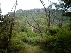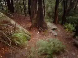 The mountain is drained by several creeks, and has many gullies on its slopes such as the ones present on the ring track and the one directly south of the mountain known as Hell Hole after an axe murder by a convict who dispatched a labourer known as Old Tom in Byarong Creek.[12] The south and western slopes are drained by Byarong Creek, which flows west of Byarong Park before descending to Figtree and then to the sea. The eastern slopes are drained by creeks that flow into Para or Fairy Creek, which flows through the Wollongong Botanic Gardens before arriving at Fairy Lagoon at Puckeys Estate Reserve. The northern slopes are drained by Cabbage Tree Creek.
