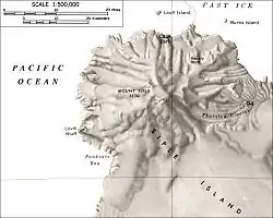 Mount Siple (/ˈsaɪpəl/ SIGH-p'l)[5] is a potentially active Antarctic shield volcano, rising to 3,162 metres (10,374 ft) and dominating the northwest part of Siple Island, which is separated from the Bakutis Coast, Marie Byrd Land, by the Getz Ice Shelf.[6] Its youthful appearance strongly suggests that it last erupted in the Holocene. It is capped by a 4-by-5-kilometre (2.5 mi × 3.1 mi) summit caldera, and tuff cones lie on the lower flanks.[3] Recely Bluff is on the northeast slope of the mountain, about 7 nautical miles (13 km) from the peak. Its volume of 1,800 cubic kilometres (430 cu mi) is comparable to that of Mount Erebus.