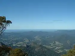 Mount Warning (Bundjalung: Wollumbin[1]), a mountain in the Tweed Range in the Northern Rivers region of New South Wales, Australia, was formed from a volcanic plug of the now-gone Tweed Volcano. The mountain is located 14 kilometres (9 mi) west-south-west of Murwillumbah, near the border between New South Wales and Queensland.[1][3] Lieutenant James Cook saw the mountain from the sea and named it Mount Warning.[3][4]