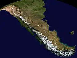 Most geologically young mountain ranges on the Earth's land surface are associated with either the Pacific Ring of Fire or the Alpide belt. The Pacific Ring of Fire includes the Andes of South America, extends through the North American Cordillera, the Aleutian Range, on through Kamchatka Peninsula, Japan, Taiwan, the Philippines, Papua New Guinea, to New Zealand.[3] The Andes is 7,000 kilometres (4,350 mi) long and is often considered the world's longest mountain system.[4]
