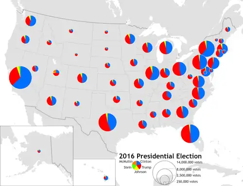 A bivariate map or multivariate map is a type of thematic map that displays two or more variables on a single map by combining different sets of symbols.[1] Each of the variables is represented using a standard thematic map technique, such as choropleth, cartogram, or proportional symbols. They may be the same type or different types, and they may be on separate layers of the map, or they may be combined into a single multivariate symbol.