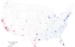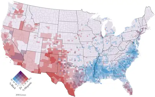 Multivariate thematic maps found a resurgence starting in the middle of the 20th Century, coinciding with the scientific turn in geography. George F. Jenks introduced the bivariate dot density map in 1953.[6] The first modern bivariate choropleth maps were published by the U.S. Census Bureau in the 1970s.[7] Their often complex patterns of multiple colors has drawn acclaim and criticism ever since,[8] but has also led to research to discover effective design techniques.[9][10]