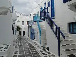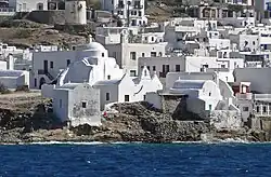 Mykonos's nickname is "The Island of the Winds",[5][6] due to the very strong winds that usually blow on the island. Tourism is a major industry and Mykonos is known for its vibrant nightlife.[7][8][9]