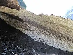 Névé /neɪˈveɪ/ is a young, granular type of snow which has been partially melted, refrozen and compacted, yet precedes the form of ice. This type of snow can contribute to glacier formation through the process of nivation.[1] Névé that survives a full season of ablation turns into firn, which is both older and slightly denser. Firn eventually becomes glacial ice – the long-lived, compacted ice that glaciers are composed of.[2] Glacier formation can take years to hundreds of years, depending on freeze-thaw factors and snow-compaction rates.[3] Névé is annually observed in skiing slopes, and is generally disliked as an icy falling zone.