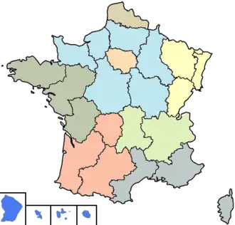 Up until 2016, the first level NUTS regions of France consisted of Ile de France, Bassin Parisien, Nord-Pas-de-Calais, Est, Ouest, Sud-Ouest, Centre-Est, Méditerranée and the Départements d'outre-mer.[1] The Départements d'outre-mer consisted of all the overseas departments of France, while the remaining eight statistical regions were made up of the 22 regions of France.