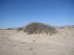 Many species of sand-dwelling plants form nabkhas. In the Chihuahuan Desert they include soaptree (Yucca elata), creosote (Larrea tridentata), and atriplex (Atriplex spp.).[1] In China nabkhas form quite often around Caragana microphylla, as well as Cleistogenes squarrosa, Leymus chinensis, Caragana stenophylla, Stipa grandis, and S. glareosa,[5] plus tamarisks, reeds, and alhagi.[4][6] In Jal Az-Zor National Park in Kuwait, they occur around Nitraria retusa, Zygophyllum qatarense, Haloxylon salicornicum, and Panicum turgidum.[2] Halophytes such as Tamarix aucheriana, Halocnemum strobilaceum and Salicornia europaea have nabkhas in saline soils, while Cyperus conglomeratus, Rhanterium epapposum, Astragalus spinosus, Lycium shawii, and Citrulus colocynthis are seen in non-saline zones.[7] On the Sinai Peninsula of Egypt they are recorded on Artemisia monosperma, Moltkiopsis ciliata, Calligonum polygonoides, Stipagrostis scoparia, and Retama raetam.[8] In central Asia and surrounding areas they occur on Calotropis, Ziziphus, Salvadora, and Heliotropium species.[9]