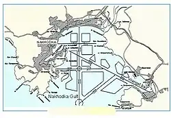 The first Russian settlement on the bay was established in 1906 and settled the following year. The village was named Amerikanka (Американка, Amerikánka) after the bay. Some initial arrivals refused to live in the settlement because they perceived its name as a reference to the United States.[7] A port was developed at Nakhodka in the 1950s, followed by Vostochny Port in the 1970s on the opposite side of the Gulf of America.[2] In 1972, the Russian Soviet Federative Socialist Republic reapplied the name Nakhodka Bay to the entire Gulf of America, eliminating a perceived reference to the United States, a geopolitical rival of the Soviet Union, as part of a broader renaming of geographical objects in the Russian Far East.[1] The smaller inlet is now known as Bukhta Nakhodka (бу́хта Нахо́дка).