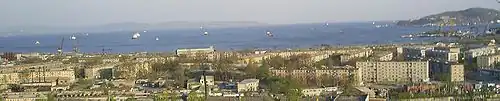 Nakhodka Bay or Nakhodka Gulf (Russian: зали́в Нахо́дка, romanized: zalív Nakhódka), historically called the Gulf of America[1] (зали́в Аме́рика, zalív Amérika), is a bay of the Peter the Great Gulf of the Sea of Japan where the port Nakhodka is located. It is part of the Primorsky Krai of Russia. The Lisy Island protects the bay from open sea waves. The word means '(lucky) find, discovery' in Russian.[2]