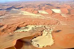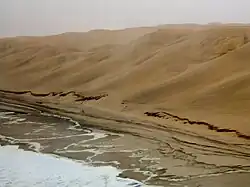 The source of the unconsolidated sand (the most recent sand sea) is dominantly from the Orange River, which drains into the Atlantic south of the Namib Sand Sea, with minor contributions in the east from the (now ephemeral) rivers that drain into the sand sea.[10] For this reason, the Namib Sand Sea has been referred to as the "wind displaced delta of the Orange River."[10]