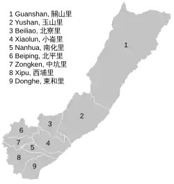 The district consists of Nanhua, Xiaolun, Zongken, Beiping, Donghe, Xipu, Beiliao, Yushan and Guanshan Village.[1]