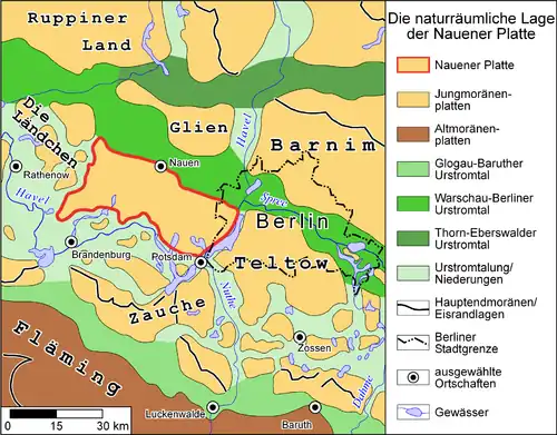 The Nauen Plateau (German: Nauener Platte) is a low plateau in the German states of Brandenburg and Berlin. It rises above the surrounding countryside by an average of 15 metres (49 ft) and is a largely contiguous upland area that was formed during the Saale and Weichselian glaciations. It consists predominantly of ground moraine deposits, partly overlain by gently rolling end moraine formations. Whilst the neighbouring regions of Zauche to the south, the Teltow to the southeast and the Barnim to the northeast have the same name as their geological formation, the cultural landscape on the Nauen Plateau bears the historical and regional name of Havelland. That said, the river country of the Havelland extends beyond the plateau to include the Havel valley and other lowland areas.