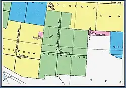 - ↑ Lands in the San Luis Valley were surveyed as part of New Mexico prior to the Civil Expenses Appropriation act of 2 March 1867 which provided for the survey of the 37th parallel north. 39th Congress, Session II, Chapter 167 (1867) 14 Statutes at Large 466 New Mexico had lost approximately 14,948 square miles, as all of the territory north of the 37th parallel was given to Colorado when it was created in 1861. 36th Congress, Session II, Chapter 59 (28 February 1861) 12 Statutes at Large 172 See Baldwin, P.E. (1930) "A Historical Note on the Boundaries of New Mexico" New Mexico Historical Review 5(2): pp. 117-137, p. 132 and map facing p. 128