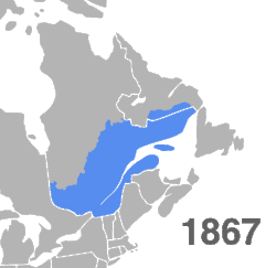 At Confederation, the Province of Canada was split in two. The eastern part, or Lower Canada, was renamed Quebec and became one of the four original provinces of the Dominion of Canada. Quebec's northern border was at the Laurentian Divide. That meant that it still shared the border with Labrador, a dependency of Newfoundland; however, the border was not clearly nor officially delimited.[9]