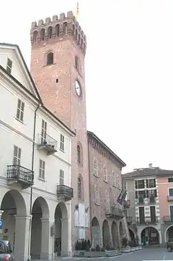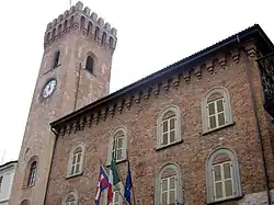 The Palazzo Comunale (Town Hall) is an imposing building with a natural brick facade dating from around the 14th or 15th century: it has served since its beginning as the seat of Nizza Monferrato's local government. The building has two upper floors, each of which has four windows, with cornice ornamentation in the form of an arched lunette. On the ground floor it has a broad internal arcade fronted by four arches, each supported by a large pillar. The coat of arms of the town is displayed above the wrought-iron balcony that links the two central windows on the first floor. The most important feature is, however, the ancient bell tower of the Town Hall, known by the citizens of Nizza Monferrato as el campanone.