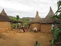 Dwelling units differ from ethnic group to ethnic group, but many follow a fairly common pattern. The house of the chief often forms the centre of a village, and houses are grouped around it with granaries nearby to help the villagers survive the dry season. Various fields of crops in turn surround homes. A common house type is a round building with a cone-shaped roof. However, houses of cement brick and roofed in sheet metal are quite common in larger settlements. Villages are often clustered along the main roads.
