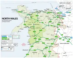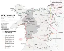 ![]() Historical extent of North Wales (red and lighter red), Montgomeryshire (lighter red) is sometimes also considered Mid Wales. Other cultural definitions of North Wales vary. | |