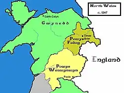 - ↑ Especially, North West Wales. Some borderlands of Wrexham and Flintshire were historically part of Powys Fadog or England.