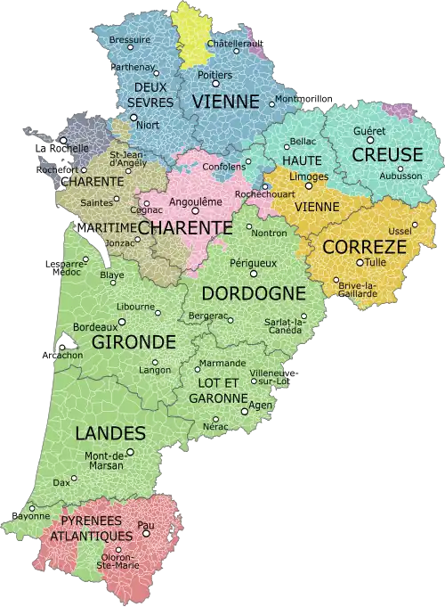 Nouvelle-Aquitaine comprises twelve departments: Charente, Charente-Maritime, Corrèze, Creuse, Dordogne, Gironde, Landes, Lot-et-Garonne, Pyrénées-Atlantiques, Deux-Sèvres, Vienne and Haute-Vienne.