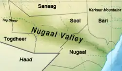 The Nugaal Valley (Somali: Dooxada Nugaal, Arabic: وادي نوجال), also called the Nogal Valley, is a long and broad valley located in northern Somalia. The Nugaal Valley is bounded to the north by the Warsangali clan, the Nugal Plateau and to the south by 'Iid.[1]