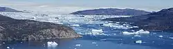Nunatakassak is located on the mainland of Greenland in the northernmost part of Upernavik Archipelago. To the south, Greenland icesheet drains into Melville Bay via Nunatakassaup Sermia glacier separating it from Wandel Land, another nunatak.[1] To the northwest lies the Nunatarsuaq nunatak, possibly isolated as a new island, with OpenStreetMap maps, and the satellite photographs of Google Maps showing the nunatak as already isolated, with fast sea-ice in place of the retreated icesheet.[3]