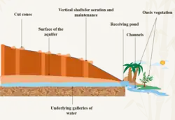 Oases develop in "hydrologically favored" locations that have attributes such as a high water table, seasonal lakes, or blockaded wadis.[4] Oases are made when sources of freshwater, such as underground rivers or aquifers, irrigate the surface naturally or via man-made wells.[5] The presence of water on the surface or underground is necessary and the local or regional management of this essential resource is strategic, but not sufficient to create such areas: continuous human work and know-how (a technical and social culture) are essential to maintain such ecosystems.[6][7] Some of the possible human contributions to maintaining an oasis include digging and maintaining wells, digging and maintaining canals, and continuously removing opportunistic plants that threaten to gorge themselves on water and fertility needed to maintain human and animal food supplies.[8] Stereotypically, an oasis has a "central pool of open water surrounded by a ring of water-dependent shrubs and trees…which are in turn encircled by an outlying transition zone to desert plants."[9]