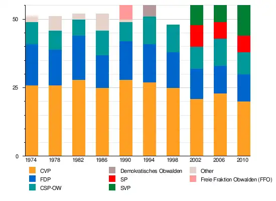In the Cantonal Council election, on 7 March 2010, the centre maintained its dominance of the Cantonal Council. The Christian Democrats lost three seats, but remained the largest party with 20. The Swiss People's Party gained five seats to become the second largest party, while the FDP.The Liberals retained 10 seats but dropped to the third largest. The Social Democratic Party remained steady with 6 seats and the Christian Social Party of Obwalden lost two seats to have 8.[15]