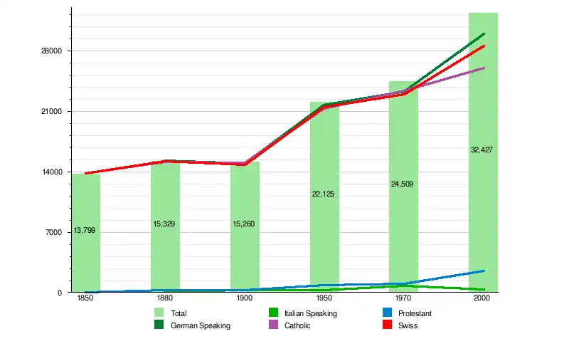 Obwalden has a population (as of December 2020) of 38,108.[2] As of 2010, 12.9% of the population are resident foreign nationals. Over the last 10 years (2000–2010) the population has changed at a rate of 8.7%. Migration accounted for 5.7%, while births and deaths accounted for 2.5%.[16] Most of the population (as of 2000) speaks German (29,920 or 92.3%) as their first language, Albanian is the second most common (452 or 1.4%) and Serbo-Croatian is the third (399 or 1.2%). There are 144 people who speak French, 329 people who speak Italian and 32 people who speak Romansh.[17]