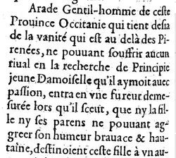 - ↑ See also, later, "Arade, genti-homme de ceste Prouince Occitanie...", in Les récits historiques ou histoires divertissantes, entremeslées de plusieurs agreables rencontres & belles reparties. Par Iean-Pierre Camus, Evesque de Belley. In Paris, at Gervais Clousier, at the Palace, on the steps of the Saincte Chapelle. MDCXLIV en linha Archived 2014-09-03 at the Wayback Machine.