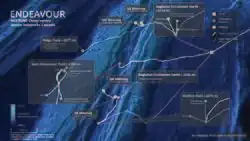 Endeavour (depth 2200–2400 m) is a northern segment of the Juan de Fuca Ridge which, in turn, is part of the complex, 80,000 km long mid-ocean ridge system spanning the World Ocean. Juan de Fuca Ridge is a medium rate spreading centre (~6 cm/yr) forming the divergent boundary between the Pacific (to the west) and the Juan de Fuca (to the east) tectonic plates . At these divergent boundaries, convection currents in the mantle rise up as magma, emerge through the rifts as lava, and crystallise as new rock (basalts and gabbro). These processes continually create new ocean crust. Hydrothermal vents, which typically form along these mid-ocean ridges, are fissures from which geothermally heated water flows. The water flowing out of vents is dominantly seawater drawn into the system through the faults, porous sediments, and volcanic rocks. As the cool seawater moves through the sediment and rock towards the hot magma, the water becomes super heated (300-400 °C) and rich in dissolved mineral elements (such as sulphur, iron, zinc and copper) from the young ocean crust. When the hot effluent is expelled, it encounters the cold, ambient seawater (about 2 °C) minerals precipitate from the element-rich vent water. At the Endeavour segment, a notably vigorous venting area, black smokers form at the high temperature vents, where the effluent is precipitating iron sulphides. This gives the plumevits dark colour and deposits sulphide-minerals, creating chimneys up to 30 m in height. There are 6 known vent fields with distinct morphologies spaced about 2 km apart along the axial rift valley of the segment.[19]