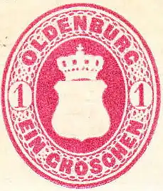 In the nineteenth century the following coat of arms was adopted: A quartered shield, above divided, below divided by an upward point. In the first field are two red crossbars in gold (Oldenburg), in the second in blue a suspended golden cross (Delmenhorst), in the third in a blue field a suspended golden cross covered with a bishop's miter (Principality of Lübeck), in the fourth a red and white checkered field (Birkenfeld), in the point in a blue field a golden, crowned lion (Jever).